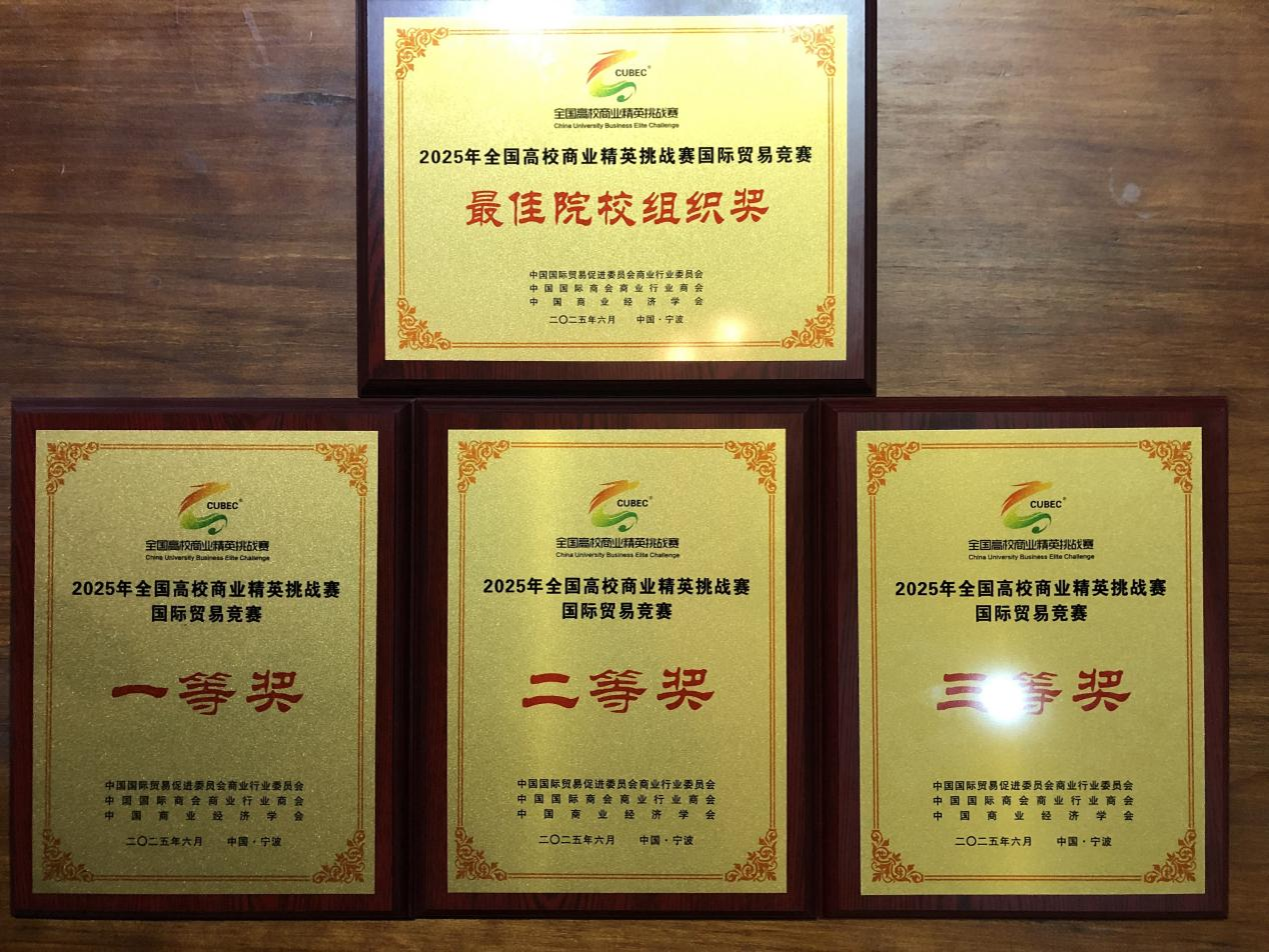 2025年6月6日至6月9日,为期四天的全国高校商业精英挑战赛国际贸易竞赛(国际贸易业务模拟赛道)总决赛在宁波圆满落幕。由我校选派的3支代表队与武汉大学、大连海事大学、上海大学等高校同台竞技,分别斩获全国一等奖1项、全国二等奖1项、全国三等奖1项,并获最佳院校组织奖。