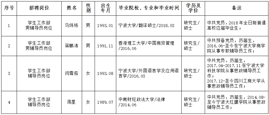按照《宁波市事业单位公开招聘工作人员实施办法》和2018年浙江大学宁波理工学院公开招聘事业编制工作人员公告(2018年2月8日)规定的程序,浙江大学宁波理工学院公开招聘工作通过公开报名、统一考试,已进入择优聘用程序。根据笔试、面试、考核、体检结果,在合格人员中,经浙江大学宁波理工学院领导班子集体研究择优确定下列4位拟聘用人员,现公示名单如下: