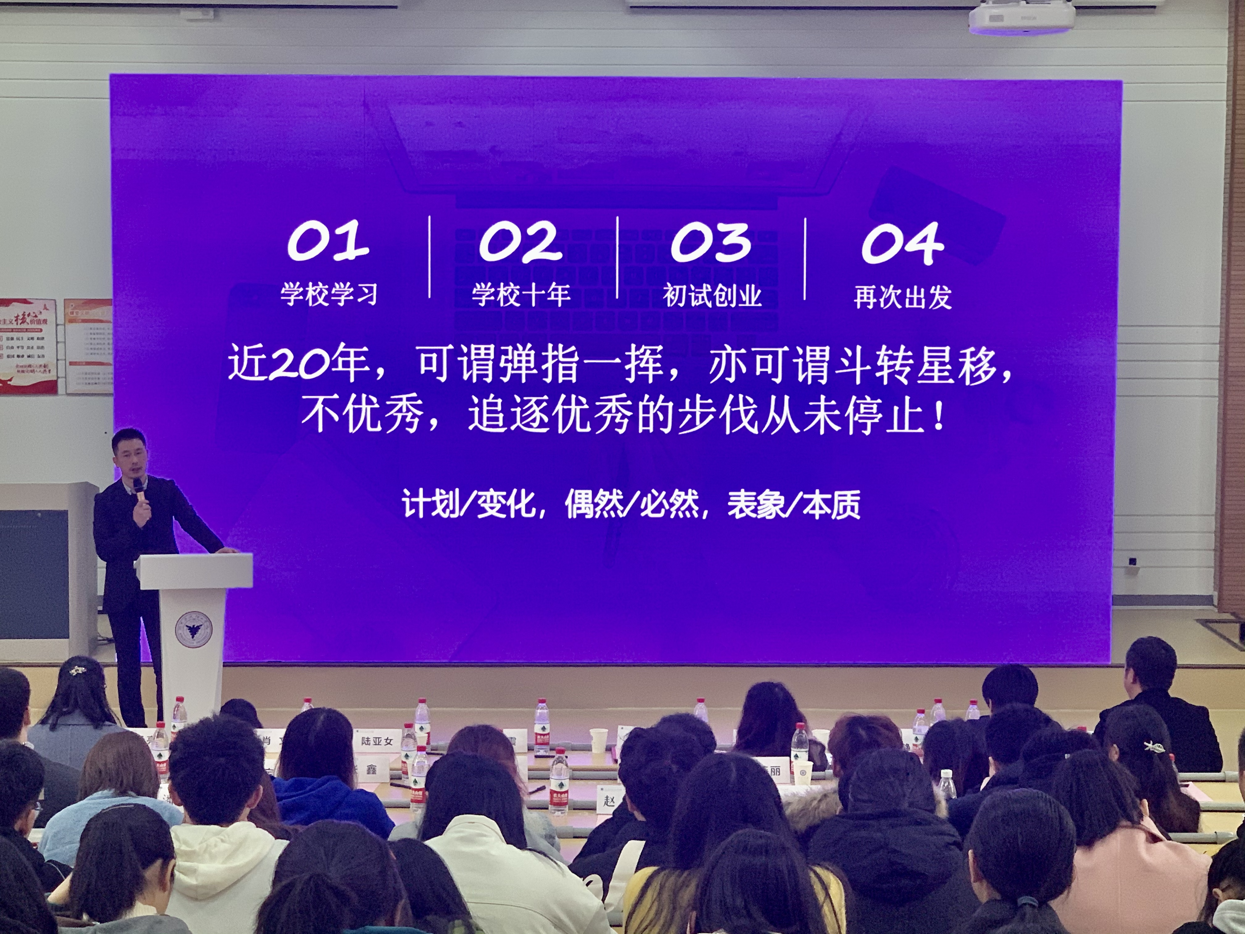 11月28日上午,商学院于SB102举办“商道·校友论坛”第二期,商学院校友分会会长、01级市场营销专业校友林博峰,校友分会副会长、01级国贸专业校友徐春浩应邀分享,学院党委书记李萍萍、党委副书记周丽娟、学工办辅导员,新生200余名同学参会。论坛由周丽娟主持。