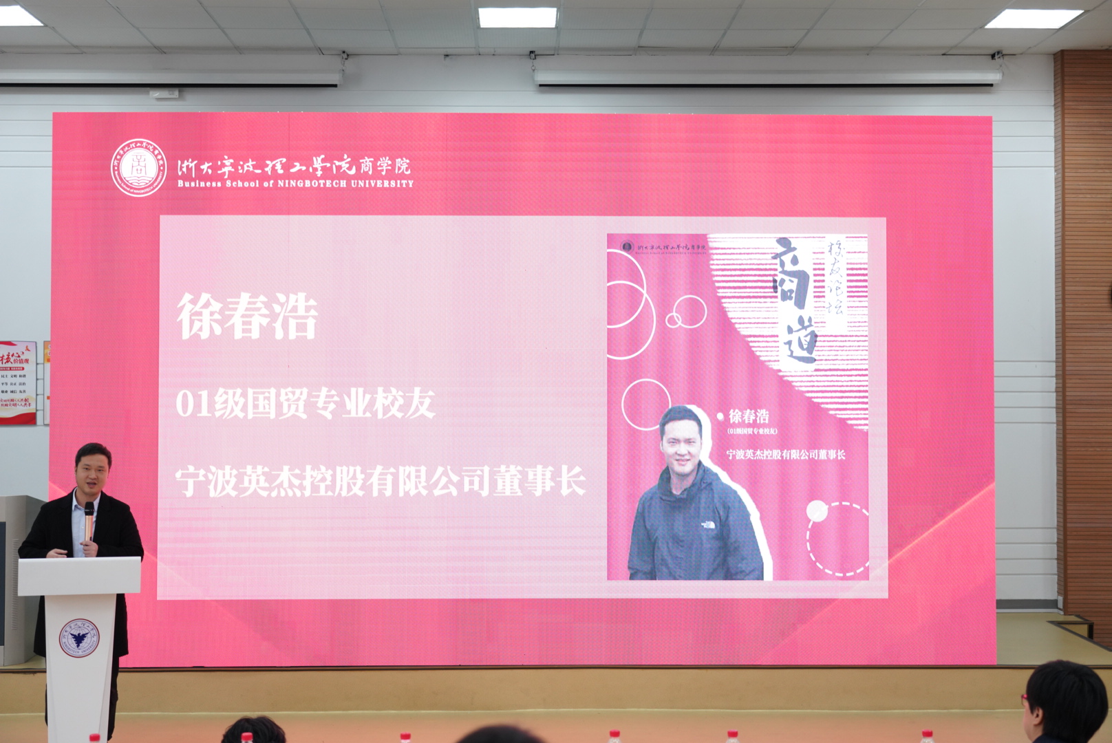 徐春浩,现任宁波英杰控股公司董事长。他从浙大老校长竺可桢的话引出了对在校大学生的建议,包括“三分做事,七分做人”的准则、塑造明确的个人风格与作风、凝练心境锻炼胸怀和勇于实践等。最后他希望学弟学妹们能“立长志”,而不是“常立志”,希望同学们把握在校学习的机会,立下坚定的志向并为之奋斗。