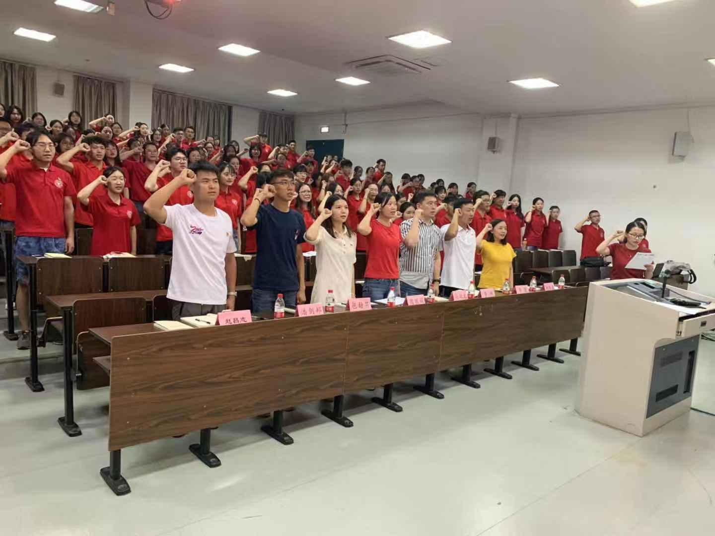 会议伊始,电商支部书记柯乐乐老师带领新党员郑重宣誓,老党员亦是标杆挺直,于庄严氛围下重温誓词。