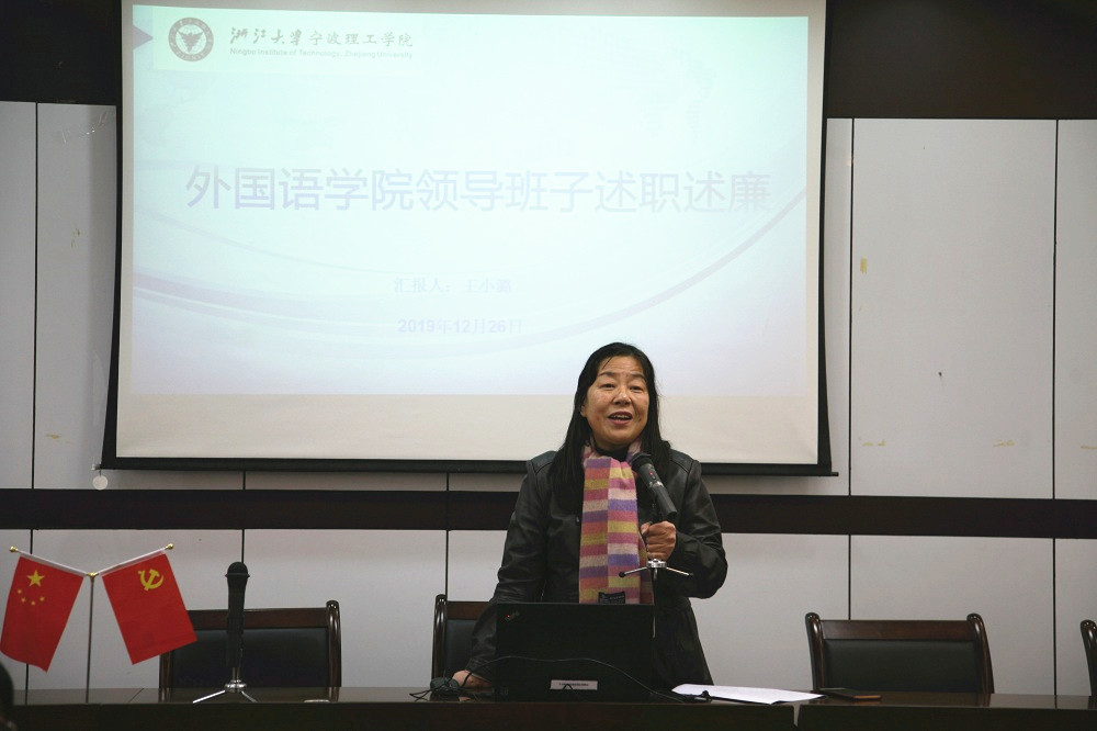 首先由王小潞院长作了2019年外国语学院领导班子述职述廉工作报告。她回顾了过去一年里学院领导班子在廉政建设、教学与科研、师资队伍建设、教育国际化、学生实践和特色平台等方面所取得的成绩。同时,分析了学院在师资队伍建设,教学科研能力提升,大学英语教学改革,科研团队培育和学生素质教育等五方面存在着不足,并提出了今后努力改进的方向与办法。随后王小潞院长、傅晓宇书记、蔡亮副院长、周汶副院长和任凯副书记分别就个人分管的工作进行了述职述廉汇报。