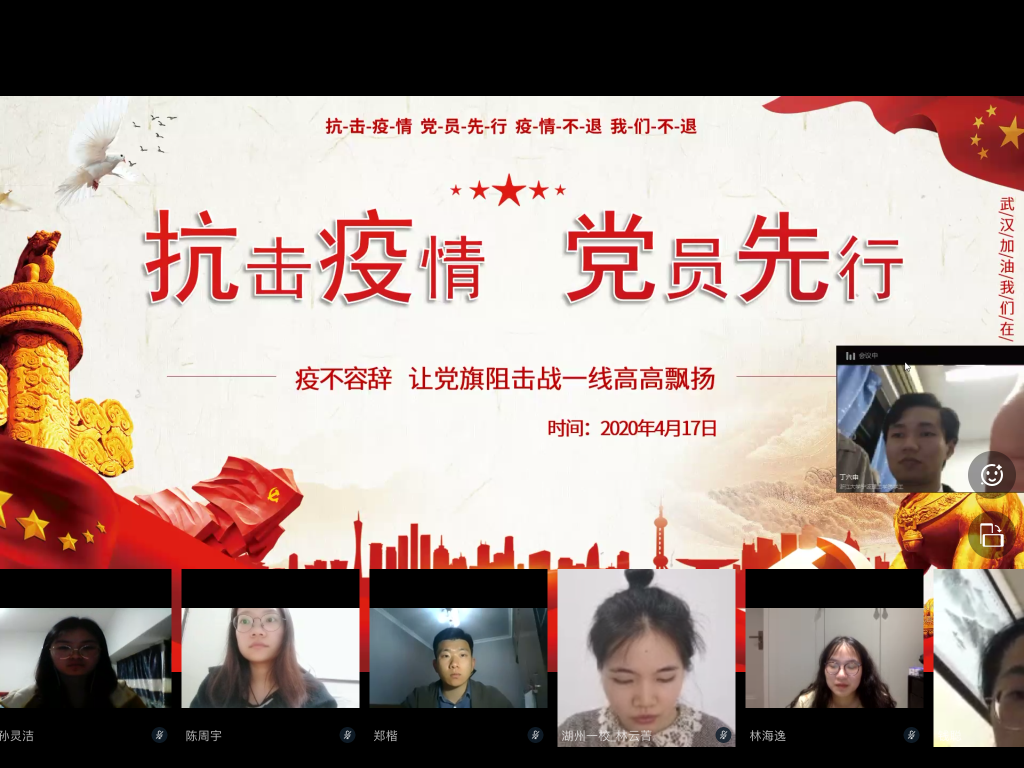活动伊始,党员们一同“云”观看了《抗击疫情纪录片——钟南山》,感受独特视角下的国土担当,体悟共产党员的初心和使命。随后,教师党员丁六申作了《争当时代先锋,筑牢青年脊梁》专题党课:回顾过去,面对非议,青年党员们不畏艰苦,不畏挑战,争做时代发展的先锋;立足当下,在“战疫”中,敢于担当,甘于奉献,筑牢永不弯曲的脊梁;展望未来,也要用行胜于言的激情和干劲为自己代言。学生党员项紫嫣作了《逆行终不止,先锋源小事》专题党课,通过分享李兰娟院士、钟南山教授等人的事迹,号召大家要积极关心自己身边的人,时刻牢记为人民服务,在黑暗中点亮自己,照耀他人。