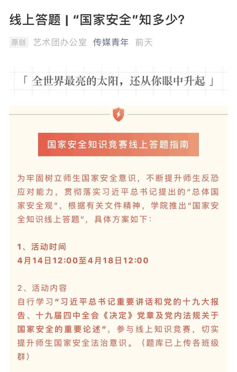 此外,4月14日-18日,传媒学院在“传媒青年”订阅号上发起了国家安全知识竞赛,同学们积极响应,截至目前,已有500多名学生完成线上答题。国家安全是国家生存和发展最基本、最重要的前提,希望师生们进一步提升维护国家安全的自觉性和主动性,共同担起这份神圣的责任!