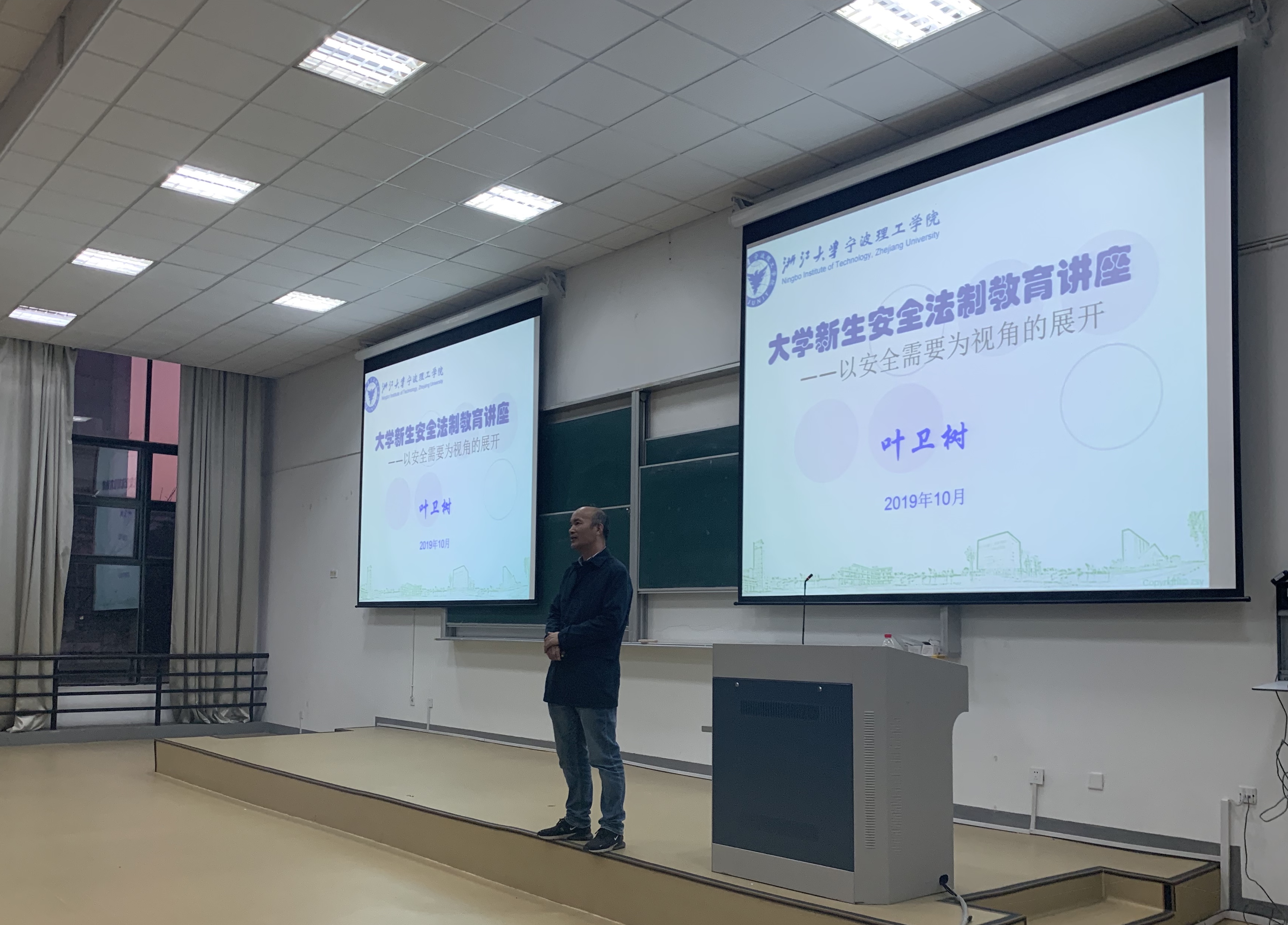 讲座伊始,胡鹿鸣老师向现场同学们强调了开展安全法制教育的现实意义。随后,讲座正式开始,叶卫树老师基于“安全是大学生的基本需要”这一背景,以安全需要视角展开,指出预防是实现安全需要最有效的途径。叶老师结合具体案例,从安全教育形式、新生对待安全教育的态度,诈骗及其防范等方面进行详细讲述。生动的话语,精彩的互动,讲座现场不时响起热烈的掌声。