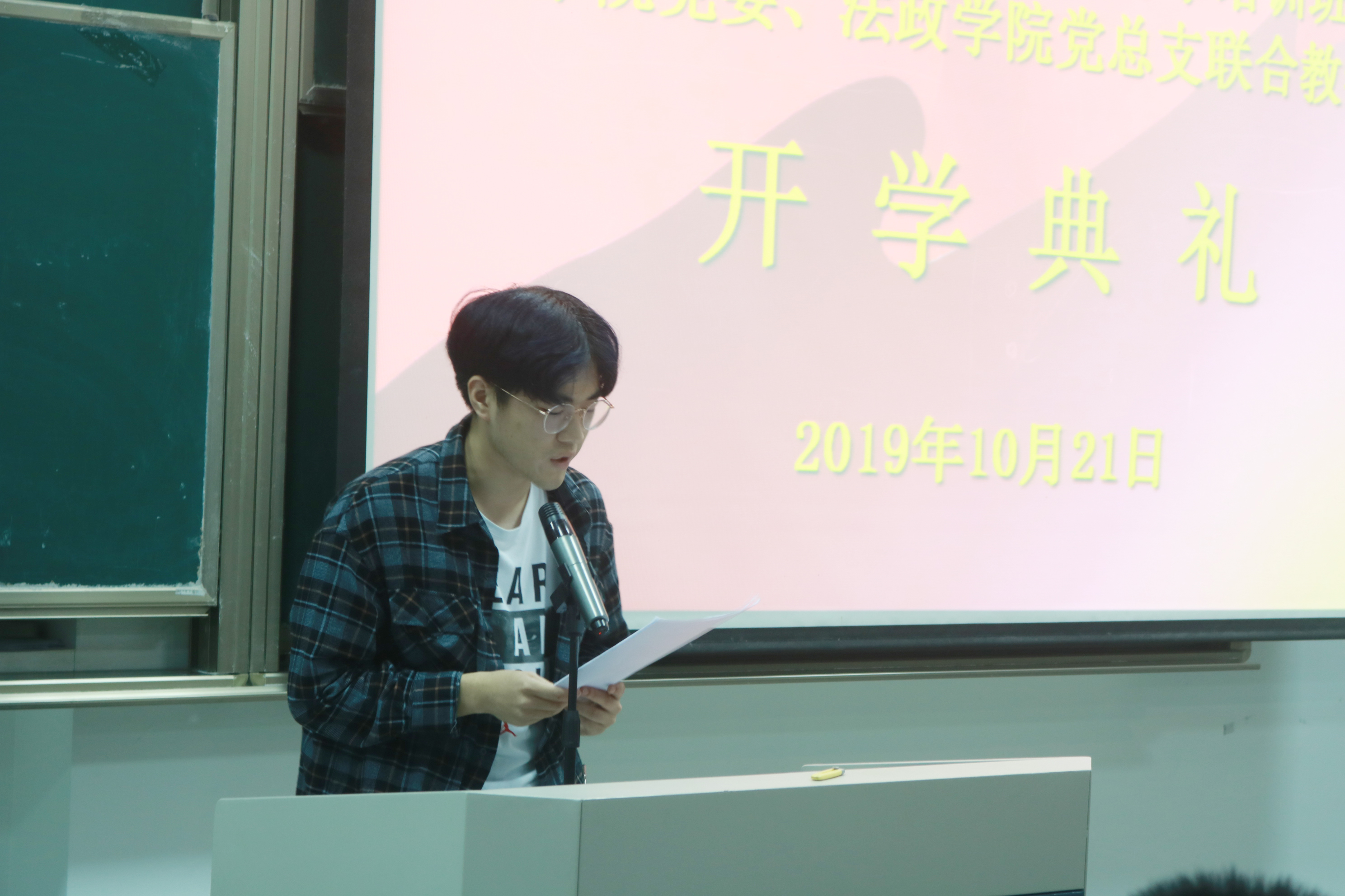 在主持人法政学院思政主管邬旭东老师宣布典礼正式开始之后,全体师生起立,奏唱国歌。党校班导师曲昊杨老师宣读了党校授课计划、入党积极分子培训班学员课堂纪律和入党积极分子培训班学员请假制度,并希望大家能够严格遵守党校相关规定。法政学院法学182班汪昊阳同学作为本期党校学员代表进行发言,他阐述了自己对党的认识和不断向党靠拢的历程,表示会在思想、学习、工作、生活等方面发挥先锋模范作用,积极为同学们树立榜样,时刻准备着投身到社会主义现代化建设。他代表全体学员宣读了《入党积极分子党校学员承诺书》,并带领学员们在承诺书上签上自己的名字。