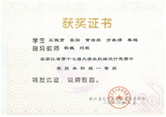 本次竞赛主题为“智慧家居、幸福家庭”,内容为“设计与制作用于1)帮助老年人独自活动起居的机械装置;2)现代智能家居的机械装置”。自2019年7月正式启动以来,吸引了全国678所高校的4719余支队伍参赛。经校赛选拔我校推荐了4件作品参加了浙江赛区的比赛,最终,由教师杨巍、刘毅指导的王俊贤、姜阳、黄浩然、方卓婷、秦超等5位同学完成的“老年人步行辅助机器人”作品获浙江省第十七届大学生机械设计竞赛一等奖。由教师胡利永、詹建明指导的刘艳超、杨慧宇、付园园、张章健、钱家鑫等5位同学完成的“自动套袋打包与基本处理垃圾桶”作品获浙江省第十七届大学生机械设计竞赛三等奖。“基于物联网的智能配药机”的作品代表浙江赛区参加国赛并获二等奖。