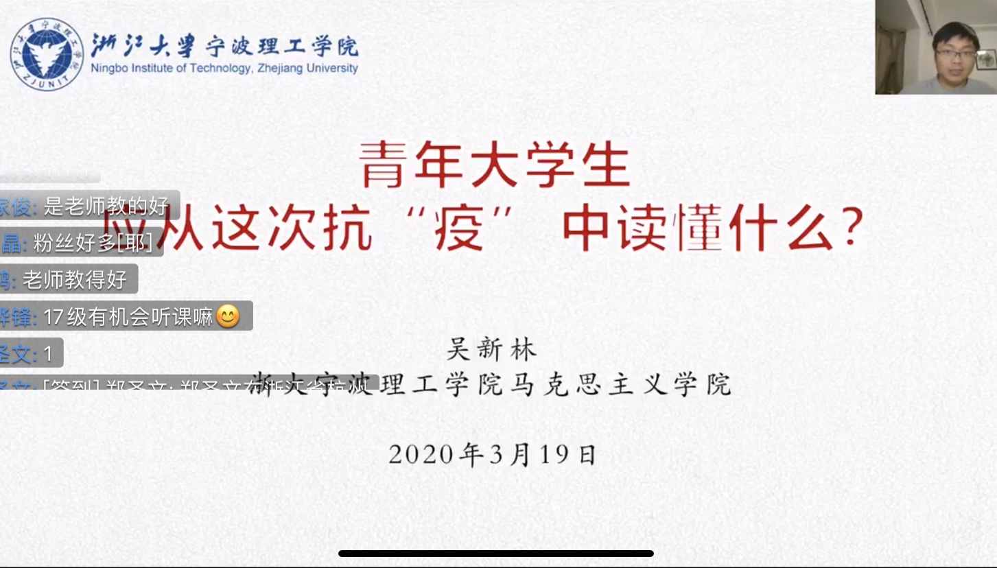 机能学院党委于3月19日邀请马克思主义学院吴新林老师为全体学生党员、积极分子带来《青年大学生应在抗“疫”中读懂什么》讲座,吴老师作为一名湖北人,结合自身的学习体悟,从多维度展现了本次新冠疫情防疫工作中彰显的中国力量和中国精神,讲座吸引了两百余名师生在线观看,反响热烈。