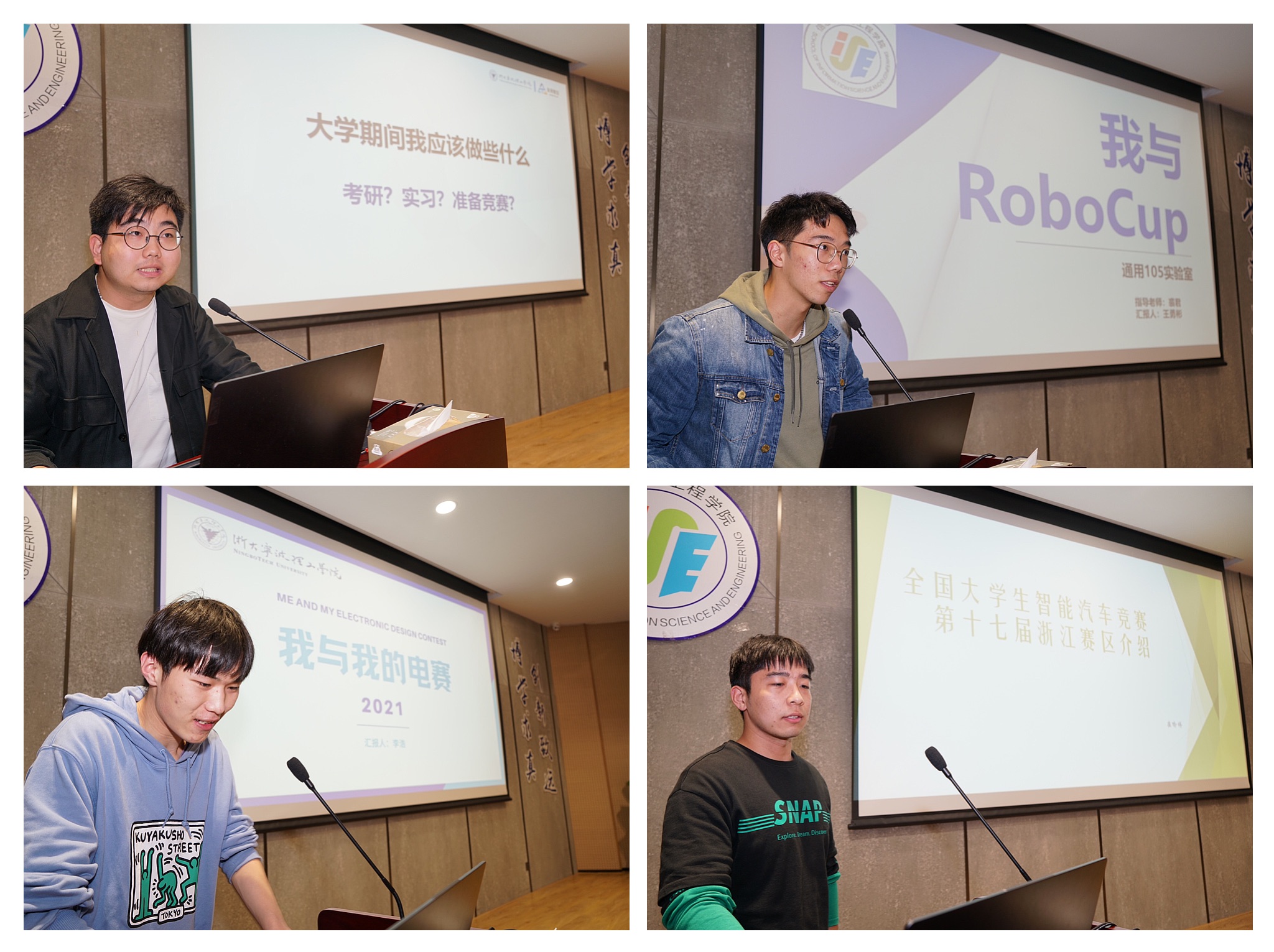 最后,获第十二届“挑战杯”省一等奖的校友吴海旭、获浙江省第五届大学生机器人竞赛二等奖的王勇彬、获浙江省大学生电子设计竞赛一等奖的李浩以及刚参加完全国大学生智能制造竞赛的崔喻博与在场的师生分享了“我与竞赛的故事”。通过讲述他们在参加各类竞赛的所思所想所感,多维度给大家展示了学科竞赛的“别样魅力”,并号召同学们开拓创新能力,不负青春、不负韶华,勇于追逐自己的梦想。