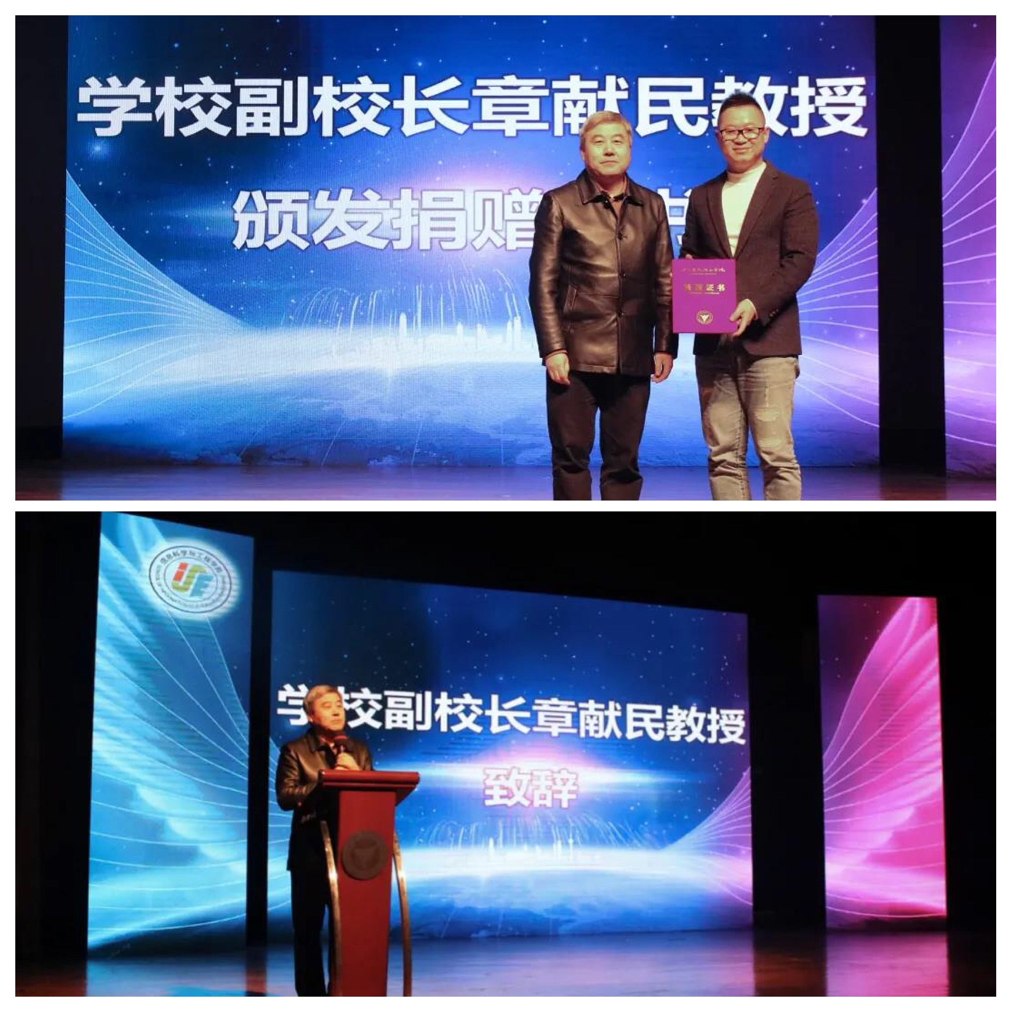 章献民教授为宁波伊士通技术股份有限公司代表颁发捐赠证书。他指出,伊士通技术股份有限公司在信息学院设立企业专项基金,不仅是对优秀学子物质上的激励,更是对他们今后明德正行、以感恩之心回馈社会的精神感召,展现了企业的大爱和社会担当。他勉励获得企业奖学金的信息学子以此为动力,心怀感恩,要用发展的眼光审时度势,以创新的手段推开机遇之门,凭非凡的毅力克服艰难险阻,担负起社会的责任。同时,章校长对浙江大华技术股份有限公司的倾情赞助表示感谢,并希望未来进一步加强合作。