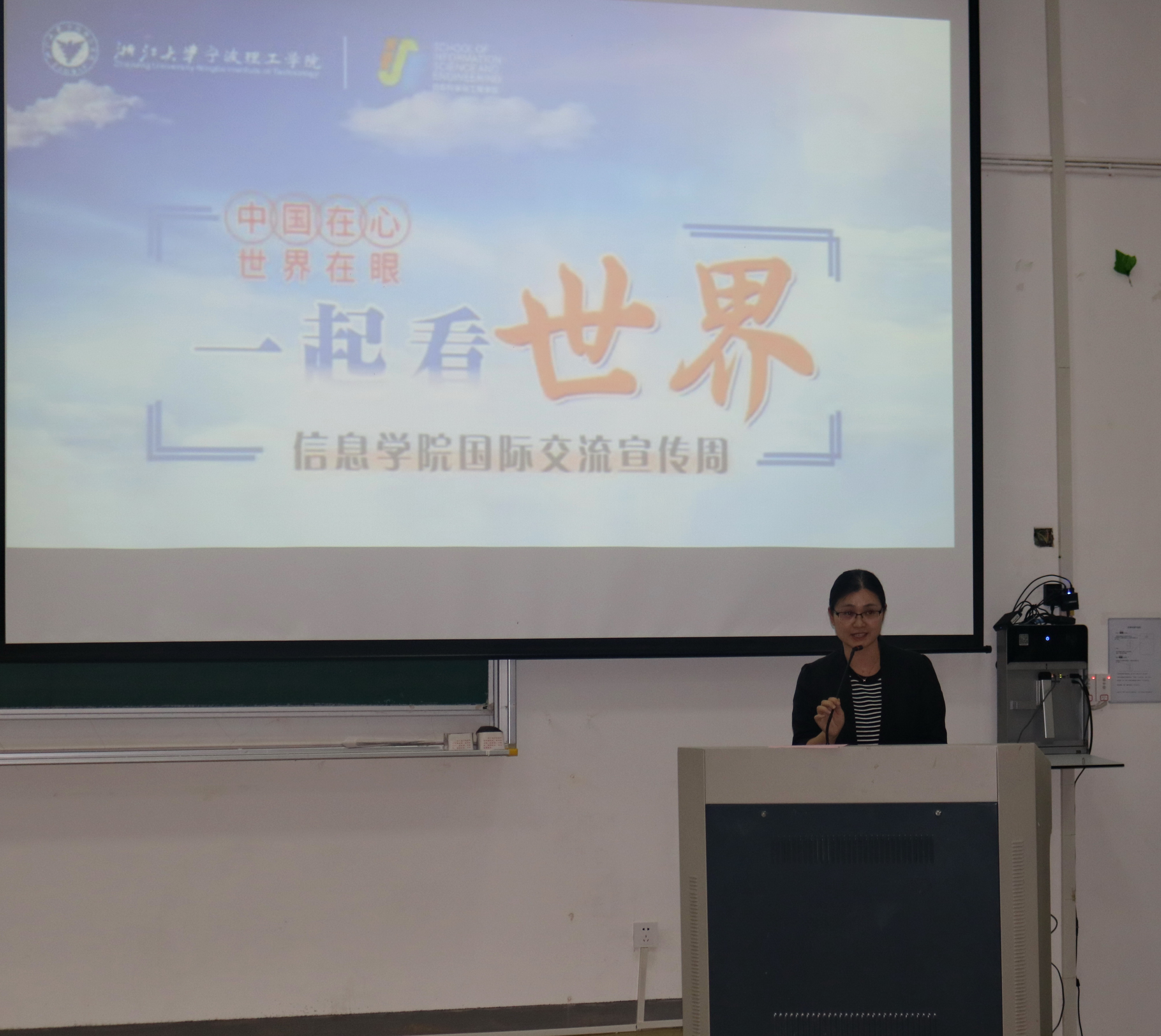 10月16日晚,作为信息学院新生始业教育重要内容之一的“一起看世界”国际交流宣传周启动仪式在SB104举行,到场嘉宾有外事处副处长程萌老师、外语学院国际项目负责人林晶晶老师、学院副院长陶吉利老师、学院副院长裘君老师,会议由学院副书记方芳主持,学院外事秘书王媛媛老师、学工主管杜明珠老师及2019级全体新生参加了此次大会。