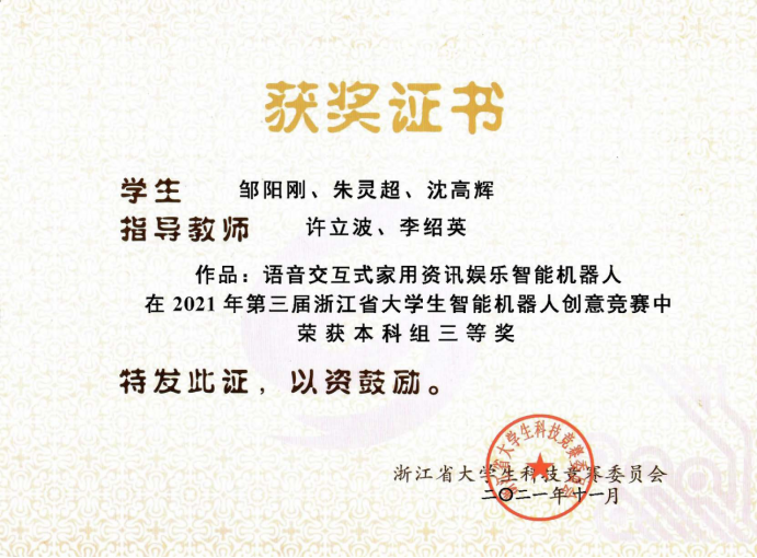 近日,在由浙江省大学生科技竞赛委员会主办的第三届浙江省大学生智能机器人创意竞赛中,我院由张浩澜、卢焕达老师指导,电气求是班姜轶剑、数据科学与大数据技术专业王焕焕,陈帆同学组成的团队荣获二等奖;由许立波、李绍英老师指导,数据科学与大数据技术专业邹阳刚、朱灵超、沈高辉同学组成的团队荣获三等奖。