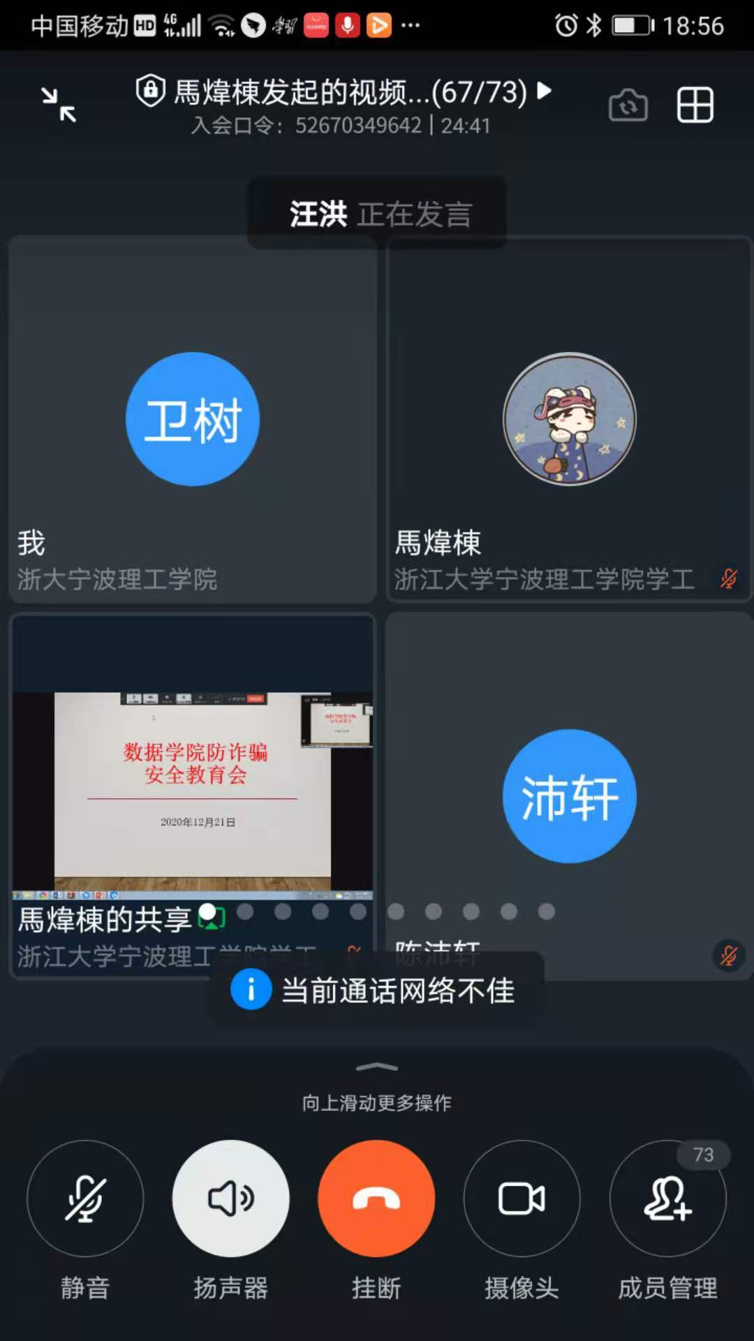 为增强学生安全防范意识,进一步提升学生防诈骗能力,数据学院于2020年12月21日晚举办线上反诈骗安全宣讲会。学校保卫处副处长叶卫树、学院党委副书记汪洪出席,学工办老师和学院班长、生活委员参加。