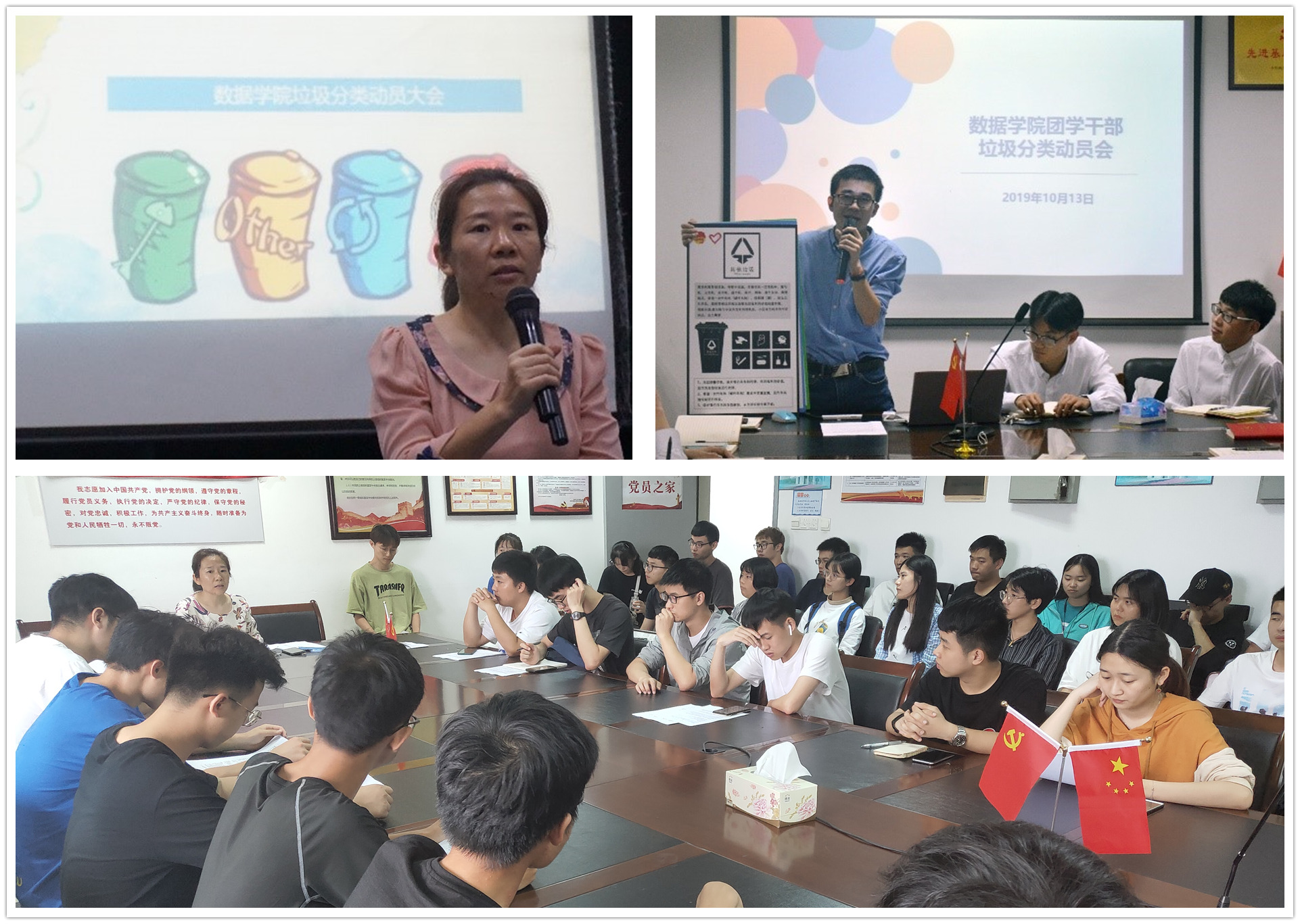 为响应学校垃圾分类政策,科普垃圾分类知识,数据学院于近期分别召开了年级大会、班长会议、团学干部会议,在多个场合向学生普及垃圾分类知识。