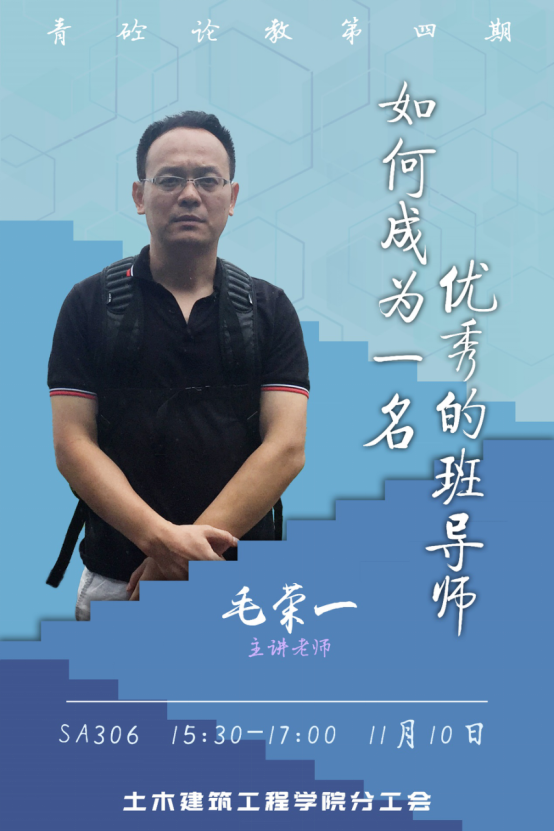 11月10下午,土建学院分工会邀请了学院智能建造和智慧管理研究所的毛荣一老师和学生工作办公室的周星老师在sa306开展了“如何成为一名优秀的班导师”的专题讲座。土建学院副书记邬旭东和多位青年教师参加。