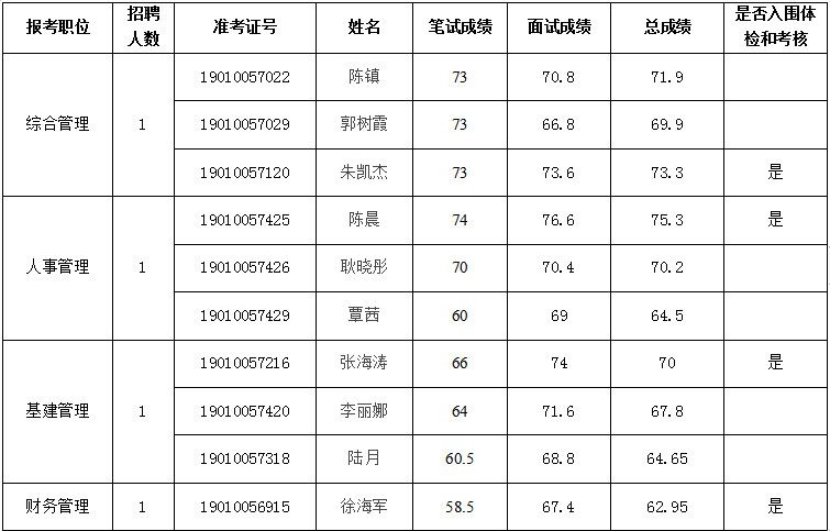 根据《宁波市事业单位公开招聘工作人员实施办法》和《2019年浙江大学宁波“五位一体”校区公开招聘事业编制管理人员公告》(2019年2月19日),我校2019年上半年公开招聘事业编制工作人员面试工作已经结束,现将参加招聘职位面试考生的面试成绩及总成绩予以公布。按照本次招考公告规定,在面试合格人员中按总成绩从高分到低分按招考计划1:1的比例确定体检、考核对象。