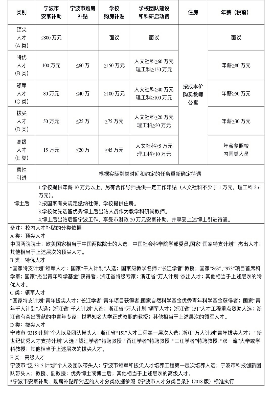 学校根据引进人才层次及聘用方式提供不同酬薪待遇及支持政策,具体详见附表《人才待遇一览表》